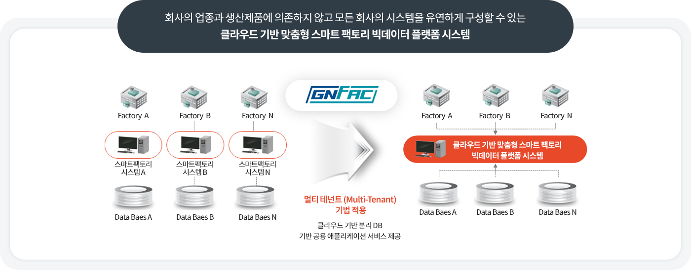 회사의 업종과 생산제품에 의존하지 않고 모든 회사의 시스템을 유연하게 구성할 수 있는 클라우드 기반 맞춤형 스마트 팩토리 빅데이터 플랫폼 시스템 멀티 테넌트(Multi-Tenant) 기법 적용 - 클라우드 기반 분리 DB 기반 공용 애플리케이션 서비스 제공
