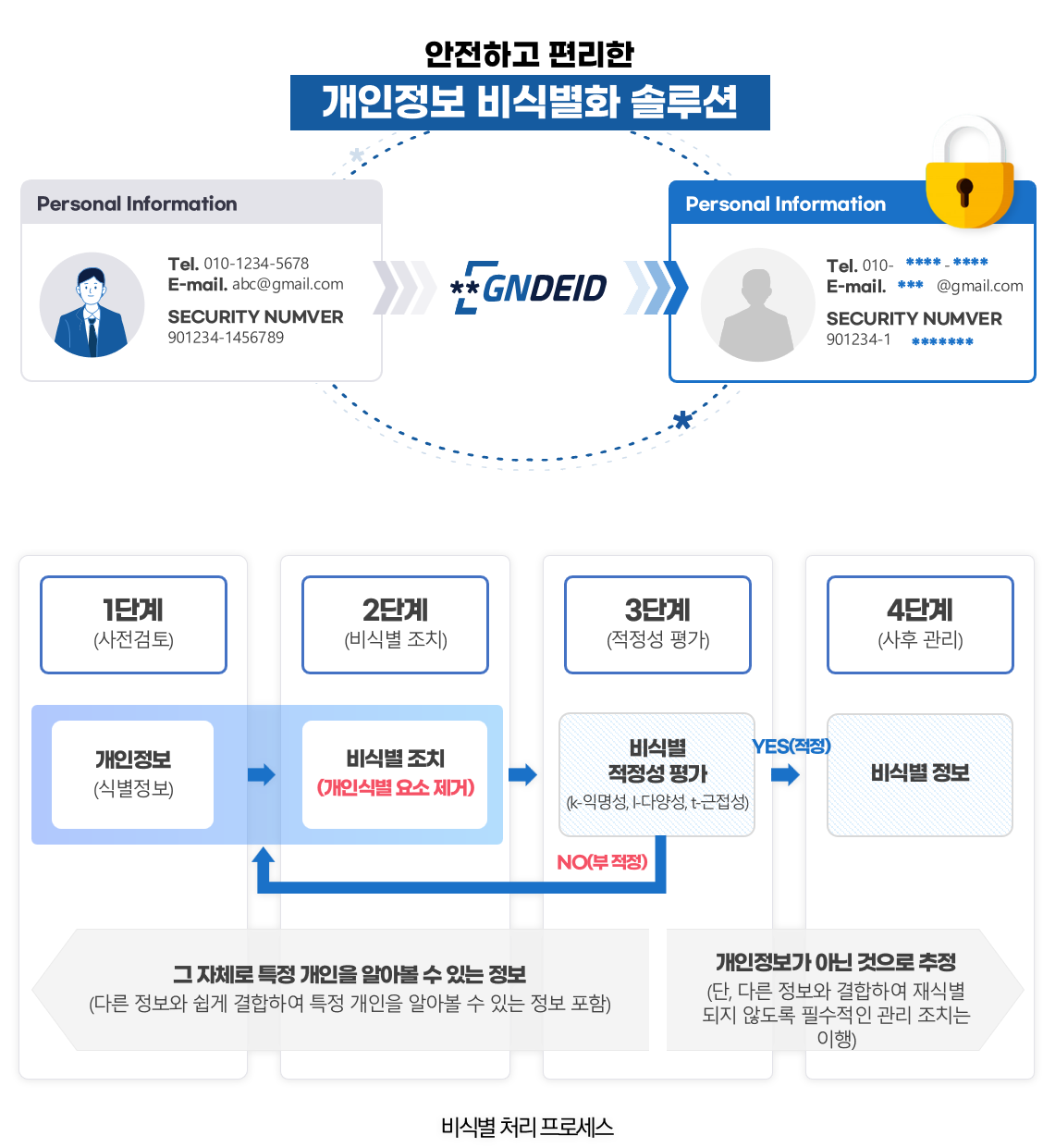 개인정보가 포함된 정형, 비정형데이터를 대상으로 개인정보 식별 가능 데이터를 비식별화 기법(가명 처리, 총계 처리, 데이터 삭제, 데이터 범주화, 데이터 마스킹 등), 프라이버시 모델(k-익명성, l-다양성, t-근접성)을 사용하여 개인정보 식별 데이터를 비식별 조치 후, 재식별 가능성 검토 기법을 통하여 결과에 대한 적정성 검토 기능을 제공하는 솔루션