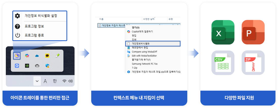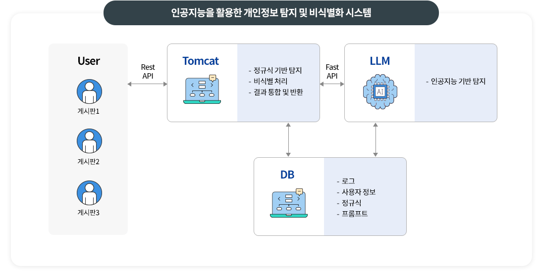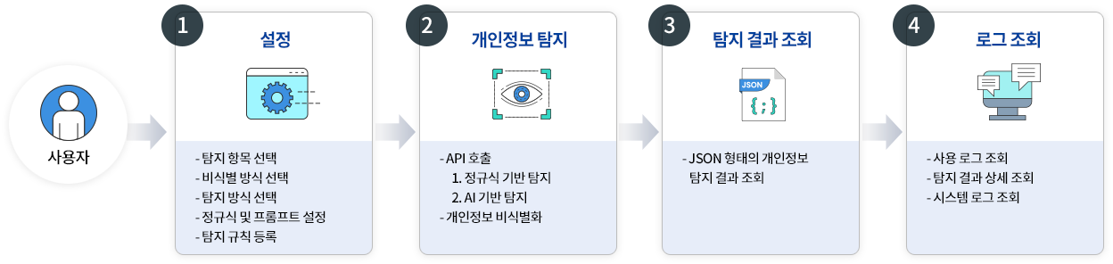 데이터에서 개인정보를 안전하게 보호하고 활용하기 위한 인공지능 개인정보 탐지 및 비식별화 시스템으로, 사용자가 탐지 항목, 비식별 처리 방식, 탐지 방식을 손쉽게 설정하고 인공지능 탐지 및 패턴 인식 방식을 모두 지원해 다양한 개인정보 유형을 정밀하게 탐지 가능