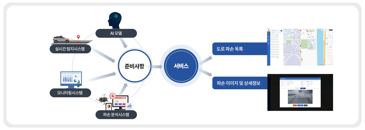 인공지능을 활용하여 도로 파손 패턴 학습 및 실시간 도로 파손 탐지 모델을 사용하며 웹 서비스 기반 PC와 모바일 기기를 통해 실시간으로 도로 파손 이미지 및 위치정보 제공하는 인공지능 도로 파손 탐지 및 통계 분석 기반 도로 관리 시스템